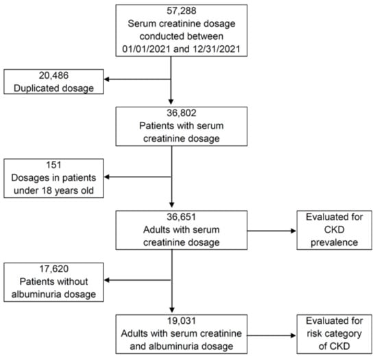 A total of 57,288 ambulatory dosages of serum creatinine were performed in the studied period. After excluding repeated dosages in the same patient (n = 20,486) and dosages in patients under 18 years old (n = 151), 36,651 adults were evaluated for CKD prevalence. Among them, 19,031 also had UACR dosages and therefore were evaluated for risk category of CKD (Figure 1).