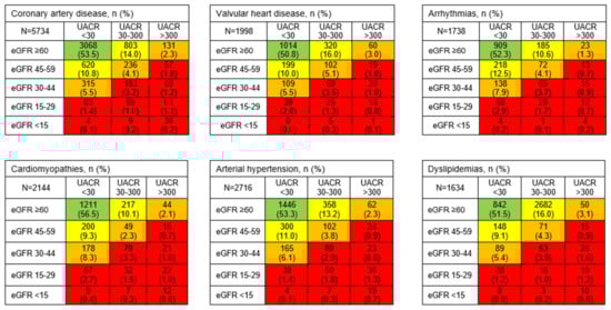 Albuminuria (UACR > 30 mg/g) was more frequent in men (30.1%) than in women (26.9%) and in the elderly age groups (36.9% in >75 years, 28.5% in 60–74 years, 26.0% in 45–59 years, 22.4% in 30–44 years, and 23.3% in 18–29 years’ group). The outpatient clinic category with the highest percentage of patients with albuminuria was dyslipidemia (32.7%), followed by valvular heart disease (31.9%), coronary heart disease (28.7%), hypertension (28.0%), arrhythmias (24.1), and cardiomyopathies (22.8%) (Table 3 and Table S2).