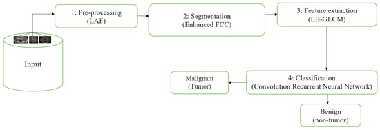 An adaptive filtering method is used in the initial stage of processing, and a clustering technique is used in the second step of segmentation. Third, a local-binary gray-level co-occurrence matrix is used to extract features. Classification with CRNN is the fourth and final process. Figure 2 is a thorough explanation and workflow of the proposed model. The proposed framework consists of four different stages: (i) the linear adaptive filter is used to denoise the input image as in the pre-processing stage, (ii) the enhanced fuzzy c-means clustering is used in the segmentation stage, (iii) the local-binary grey level co-occurrence matrix is used to extract the recommended feature in the feature extraction stage, and (iv) a convolutional recurrent neural network is used to classify the image in order to address the disordered images in the classification stage.
