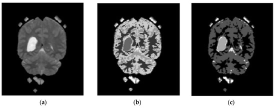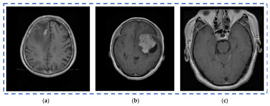 The REMBRANDT publicly available dataset, which is a publicly available database, was used to test the proposed method. The data set was partitioned into two parts: training and testing. Images of glioma tumors, meningioma tumors, pituitary tumors, and no tumors were included in both the training and testing sets. A total of 3100 images are taken, and the image dataset percentages for training and testing the proposed system framework were 80% and 20%, respectively. Thus, both a training set of 2480 images and a testing set of 620 images were used, and data pre-processing operations, such as brain stripping, were offered to improve the data description [40]. However, the 3100 images were like a combination of different grade (tumor) images in order to fine-tune the proposed model to obtain a better classification accuracy [41]. The performance assessment work was divided into four groups: glioma tumor, meningioma tumor, no tumor, and pituitary tumor. Figure 9 displays many instances of various tumors: (a) meningioma, (b) glioma, and (c) pituitary. Table 2 illustrates the total number of images that were used in the proposed system during the training and testing phases.