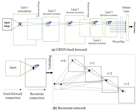 Here, is referred to as a feed-forward and is an input of the recurrent, where these are vectorized points aligned at (i, n) of the present layer feature map. Here, are the weights of the feedforward, is a weight of the recurrent, and is the bias. Equation (11) represents the two phrases of connections, such as between a traditional CNN and a recurrent network.
