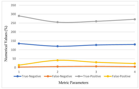 The accuracy, sensitivity, and specificity were used to estimate the results of the experiment. The true positive (TP), true negative (TN), false positive (FP), and false negative (FN) values were used to figure out these measurements. In the following equations, you can see how the evaluation measures work. The detection accuracy of brain tumors can be measured using the ratio of the population’s exact values. The following formula describes the accuracy: