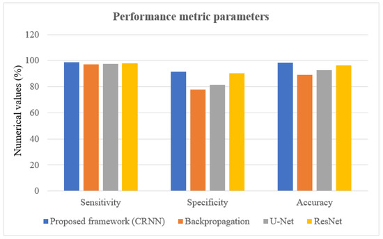 In this portion, we describe the results of applying the proposed approach to the publicly available dataset and analyzing and computing its results. A total of 620 MR images were used for testing, whereas 2480 MR images from 235 patients were used for training. The prediction model with low variation in energy levels of a comparable class that was straightforward to categorize was also included in the dataset. As a result, the proposed model was estimated using only reliable patient data. The metrics for assessment were specified for four different tumor locations: (a) glioma tumor, (b) meningioma tumor, (c) no tumor, and (d) pituitary tumor. The experimental results and a representative image are shown in Table 3. The total number of utilized images from the dataset was 620, and each image was classified as either normal (284) or malignant (336). In order to evaluate the efficacy of the proposed model, we compared it with other classifiers in Table 4. The sensitivity, specificity, and accuracy were compared across several methods in Table 5. There is an evaluation of the proposed CRNN classifier against the BP, U-Net, and CRNN methods. Table 6 depicts the proposed CRNN and other classifier evaluation parameters comparison outcomes. Figure 10 depicts the relative accuracy (in percent) of several categorization methods along an X-axis representing the methods themselves. A graph depicting the comparison of algorithms used by BP, U-Net, ResNet, and CRNN classification methods is given. The other methods of categorization produced the following results: backpropagation [34] obtained a Se of 97.11%, Sp of 77.71%, and Acc of 89.12%; the U-Net [35] obtained the outcomes of an Se of 97.56%, Sp of 81.51%, and Acc of 92.61%; and the ResNet [36] model achieved an Se of 97.9%, Sp of 90.23%, and Acc of 96.23%. The proposed CRNN showed substantial improvement in the parameter outcomes, namely, an Acc of 98.17%, Se of 91.34%, and Sp of 98.79%. Figure 11 depicts Performance metric comparison graphical representation. Figure 12 depicts the proposed model training and validation accuracy with 30 epochs.