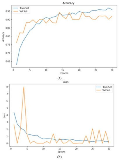 Proposed model training and validation accuracy with 30 epochs. (a) accuracy; (b) loss.