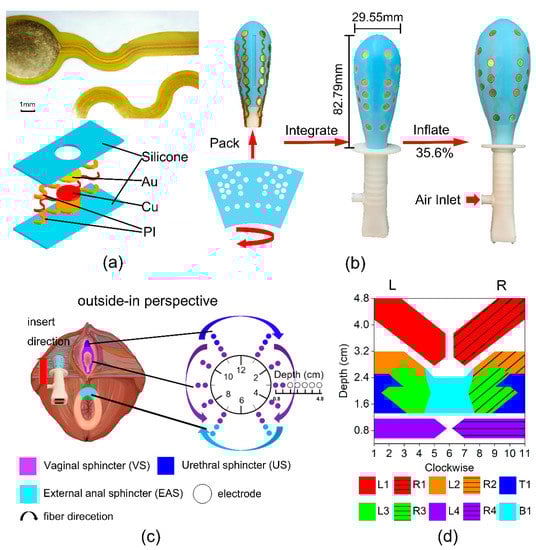 The ASEA and 10 PFM regions and distribution. (a) The localized flexible circuit image under a microscope (upper) and explosive structure (bottom) of ASEA. (b) The macro internal structure of ASEA (left), the ASEA before inflation (middle) and after inflation (right). (c) The concept map of ASEA collecting sEMG signal. The left figure is part of the PFM distribution from the outside-in perspective. ASEA is inserted from the outside of the screen to the inside. The right figure shows the clockwise, and the corresponding electrode layout direction. (d) The distribution map of 10 PFM regions based on physiology and PFM anatomy. Different regions are distinguished by different colors.