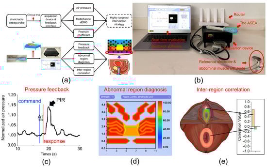 The evaluation system framework of MET is shown in Figure 2a. The air pressure signal and MC-sEMG signal collected by ASEA are transmitted to the acquisition device. The pressure signal can be analyzed directly, and the sEMG signal is divided into short sections with a 1000 ms length, and is processed by a root mean square (RMS). A 20–400 Hz bandpass filter is applied to remove all power frequency interference. All data are processed by Matlab (Version 2021b). Then, the interface analyzes the pressure feedback data to evaluate the mechanical properties of PFM, evaluates muscle function and diagnoses abnormal PFM region according to the relevant sEMG parameters, identify the specific region and calculates the inter-region correlation. Finally, we analyze the cause of abnormal state at the level of synergy, and intervened in the specific region with a highly targeted strategy.