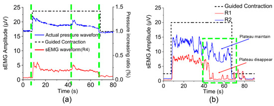 ASEA real-time waveform acquisition. The black dotted line represented the guided reference endurance contraction action. (a) Synchronous air pressure, MC-sEMG signal acquisition (by a participant in group A). The red line represented the sEMG signal collected in R4 region, and the blue line represented the air pressure signal. The green dotted line shows the time sequence consistency and details coincidence of sEMG signal and air pressure signal. (b) The sEMG waveform differentiation of endurance contraction of nearby muscle regions (by a participant in group B). The green frame showed the difference of muscle endurance status between the two adjacent regions, proving the detail of ASEA acquisition.