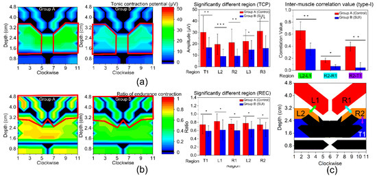 Type-I muscle function evaluation of two groups. (a) Tonic contraction potential (TCP) and (b) ratio of endurance contraction (REC) for each group. From left to right: amplitude results contour map of group A; amplitude results contour map of group B (red frame marks the significantly different regions); significantly different regions of parameter, including T1, L2, R2, L3, R3. According to the ultrasonic-assisted measurement, the muscle relationship corresponding to these regions are: T1: US; L2, R2: PC; L3, R3: PR. Asterisk indicates significant difference. *: p < 0.05; **: p < 0.01; ***: p < 0.001. (c) Inter-region correlation value of type-I muscle fiber. The upper graph is the significantly different region of correlation value and the lower is the location diagram.