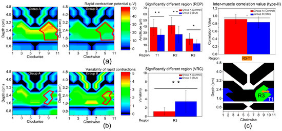 Type-II muscle function evaluation of two groups. (a) Rapid contraction potential (RCP) and (b) variability of rapid contractions (VRC) for each diagnosis group. From left to right: amplitude results contour map of group A; amplitude results contour map of group B (red frame marks the significantly different regions); significantly different regions of parameter, including T1, R2, R3. According to the ultrasonic-assisted measurement, the muscle relationship corresponding to these regions are: T1: US; R2: PC; R3: PR. Asterisk indicates significant difference. *: p < 0.05; **: p < 0.01. (c) Inter-region correlation value of type-II muscle fiber. The upper graph is the significantly different region of correlation value and the lower is the location diagram.