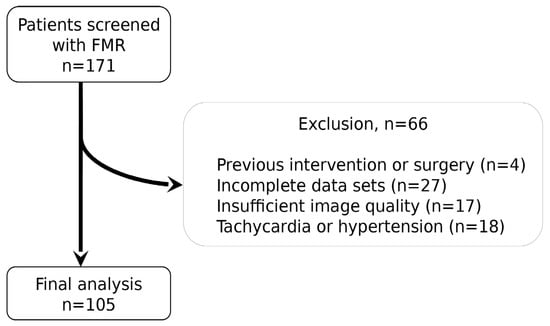 Between 2015 and 2018, we screened 171 consecutive patients with moderate to severe FMR from the “Dresden Mitral Valve Registry”. This registry prospectively enrolls patients with symptomatic mitral regurgitation referred to our Department of Internal Medicine and Cardiology, Herzzentrum Dresden, Technische Universität Dresden, Germany, for further diagnosis and treatment. Exclusion criteria for analysis in this study were pre-existing mitral valve surgery or intervention, incomplete datasets, and insufficient image quality or clinical influencing parameters (Figure 1). Stitching artifacts in 3D datasets were the main cause of insufficient image quality in most cases (n = 13), while inadequate image acquisition affected fewer cases (n = 4) in both 3D and 2D.