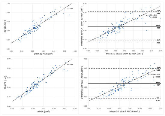 Although the 3D VCA correlated significantly with the EROA 2D PISA and AROA (r = 0.93 and r = 0.94, p < 0.001 for all), the 3D VCA comprised higher values than the EROA 2D PISA and AROA (0.47 ± 0.18 cm2 vs. 0.23 ± 0.11 cm2 vs. 0.24 ± 0.11 cm2, p < 0.001), resulting in a systematic measurement bias, as depicted in Figure 6. Mean bias between the 3D VCA and EROA 2D PISA (0.25 cm2; LoA: 0.09–0.41 cm2) and the AROA (0.24 cm2; LoA: 0.08–0.40 cm2) were statistically significant (p < 0.001 for all). In addition, the bias was proportional, with increasing amounts of regurgitation in both comparisons (R2 = 0.686 and 0.737, p < 0.001 for all).