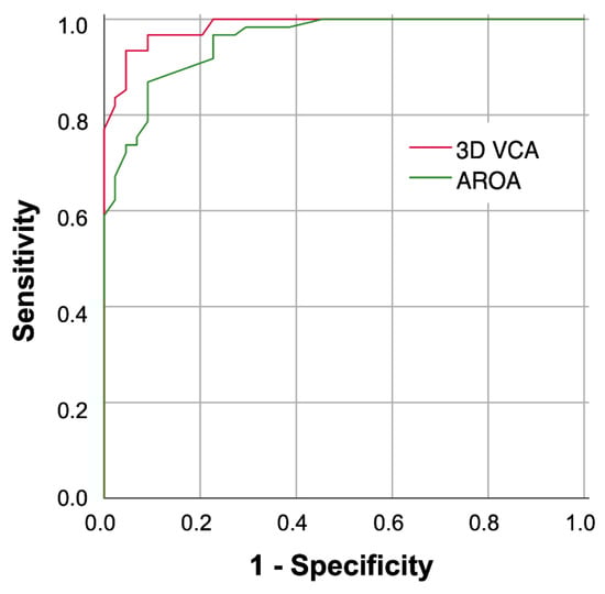 Receiver operating characteristic analysis of 3D VCA (AUC = 0.98) and AROA (AUC = 0.94). Graphical plotting of sensitivity and specificity using different methods to distinguish moderate and severe FMR classified by EROA 2D PISA (cut-off ≥ 0.2 cm2). Abbreviations: AUC = area under the curve; 3D = three-dimensional; VCA = vena contracta area; AROA = anatomic regurgitation area.