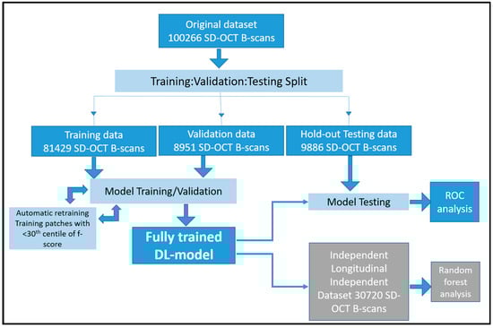 Eighty percent of all patients that were included in the study were randomly segregated into the training set (Figure 1). Visits from each patient with multiple visits were clustered together such that these data points only occurred in one dataset. This ensured the clear demarcation of datasets. The EZ At-Risk masks and corresponding original SD-OCT B-scans were used as training inputs for the DL model. Ten percent of all patients that were included in the study were randomly segregated into the validation set. This dataset was used to iteratively assess and improve performance during different epochs of model training.