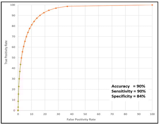 ROC illustration of the DL-based EZ At-Risk segmentation model at the individual SD-OCT B-scan level with accuracy, sensitivity, and specificity. ROC: receiver operator curve; DL: deep learning: EZ: ellipsoid zone; SD-OCT: spectral domain optical coherence tomography.