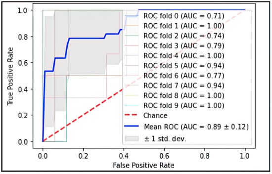 ROC illustration of the random forest model for prediction of sfGA using quantitative OCT-biomarkers including EZ At-Risk. Ten-fold cross validation was performed, and mean ROC results are represented by the blue solid line while random chance is represented by the red dashed line. ROC: receiver operator curve; sfGA: sub-foveal geographic atrophy; OCT: optical coherence tomography; EZ: ellipsoid zone.