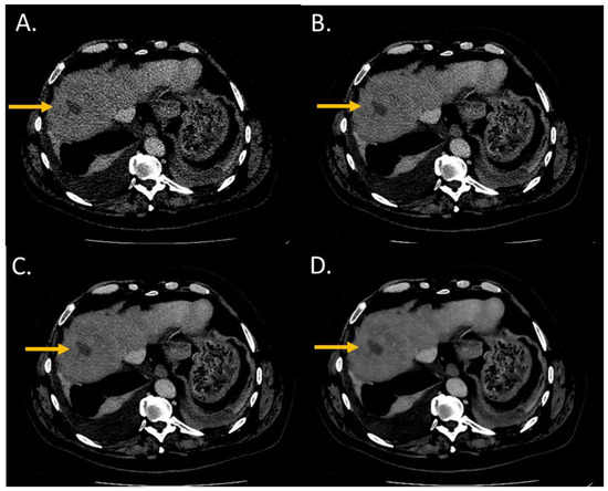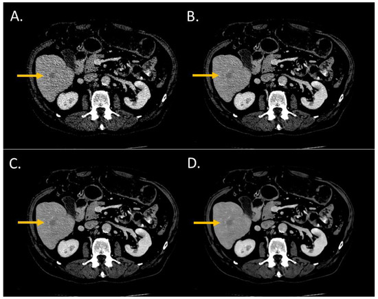 Lesion conspicuity score of liver CT images (WL: 90 HU; WW: 190 HU) of a man (64 years old, SSDE: 10.24 mGy; average scan size 34.6 cm) with a pancreatic cancer and liver metastasis of 2.70 mm of large axis in segment VIII. (A) iDose4 level 4; lesion conspicuity score: 3; (B) Precise Image, Standard; lesion conspicuity score: 3; (C) Precise Image, Smooth; lesion conspicuity score: 4; (D) Precise Image, Smoother; lesion conspicuity score: 5.