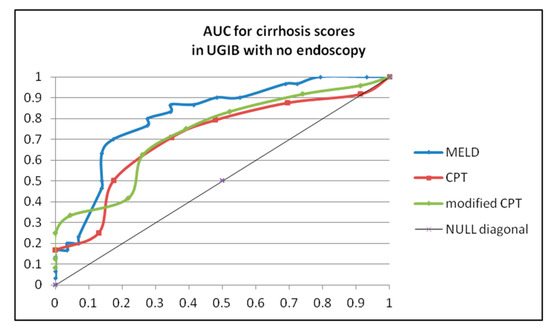 Although early endoscopy is recommended in all patients with UGIB, there are some patients who did not undergo endoscopy at all. Some of them refused the procedure, while in other cases, the general status was so altered (especially cardio-respiratory failure) that the procedure was postponed, and in some cases, not performed at all. In rare cases, the bleeding was so severe that the patients died before an endoscopy was performed; some cases of variceal bleeding were stopped because of Sengstaken–Blakemore tube placement, but the patients died due to liver failure. In some cases, alcohol withdrawal symptoms were so severe that endoscopy was not performed during admission. Therefore, the patients with no endoscopy performed represent a heterogenous group, with few studies regarding both mortality and the role of risk (non-endoscopic) scores in the prognostic evaluation. The mortality risk in the subgroup of patients without endoscopy is poorly evaluated in the literature; most studies included only patients with UGIB with endoscopy performed, and the absence of endoscopy represents one of the exclusion criteria in studies evaluating the performance of risk scores [1,3,4,10,24,25,26,27]. In this setting, a study evaluating the accuracy of prognostic scores for mortality in a subgroup of patients without endoscopy and with no known etiology for bleeding can be useful in order to predict the risk of death.