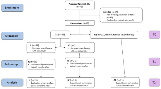 To establish the diagnosis of peri-implant mucositis, we examined the patients clinically (PI, PPD, and BOP) and radiographically. In G1, these assessments were made for two implants located at a certain distance from each other to ensure an objective assessment of the peri-implant status. If the patient presented several implants, the two implants that had the highest values of the recorded periodontal indices were included. In G2, the implants that recorded the most advanced signs of peri-implant mucositis were included. In group 1, laser therapy was randomly applied to one implant (IL), so that we could compare the values of the periodontal indices for IL with those obtained from the implant that did not receive active light (IC) in the same patient. Thus, the evaluation of the laser therapy was an objective one without oral hygiene habits, which differ from one patient to another, influencing the results.