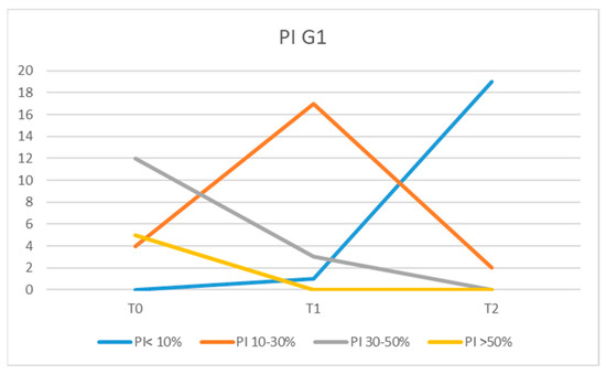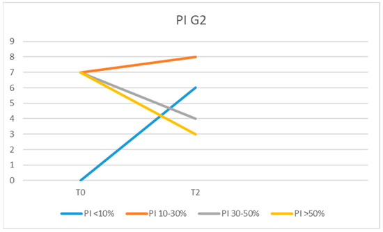 The values recorded for PI in patients from group G2 at T2 moment, were low in most patients compared with the T0 moment. The values recorded at T2 were PI > 50% for three patients, PI = 30–50% for four, PI = 10–30% in eight of the patients, and PI < 10% in six of them (Figure 3). However, three patients had PI values similar to those recorded at moment T0, and two patients showed higher PI values.