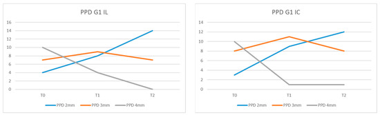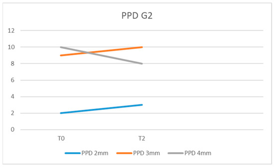 In G2, we recorded at the initial examination (T0) PPD = 4 mm in 10 of the examined patients, PPD = 3 mm in 9, and PPD = 2 mm in 2 of them (Figure 5).
