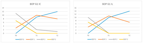 In G1 IL, at moment T0, no patient had BOP = 0, 4 had BOP equal to 1, 10 had BOP = 2, and 7 had BOP = 3. At moment T1, 10 patients had BOP = 0 and 11 patients BOP = 1, and at time T2, 14 of them had BOP = 0, and 7 patients BOP = 1 (Figure 6).