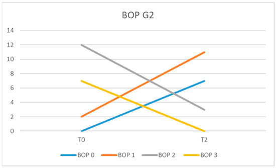 In the G2 group at the initial examination (T0), 7 patients presented BOP = 3; 12 had BOP = 2; and, in 2 patients, we recorded BOP = 1. At the 6-month examination (T2), the recorded scores for BOP were 2 for 3 patients, 1 for 11 patients, and 0 for 7 of them (Figure 7).