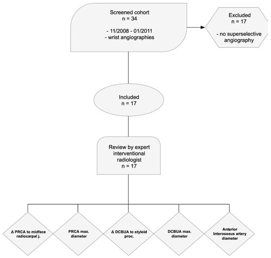 Between November 2008 and January 2011, the picture archiving and communication system was screened for SCAW at a large metropolitan trauma center with dedicated hand and wrist surgery. All consecutive cases were identified and included in the study retrospectively. Non-superselective wrist angiographies were excluded from the study (Figure 1).