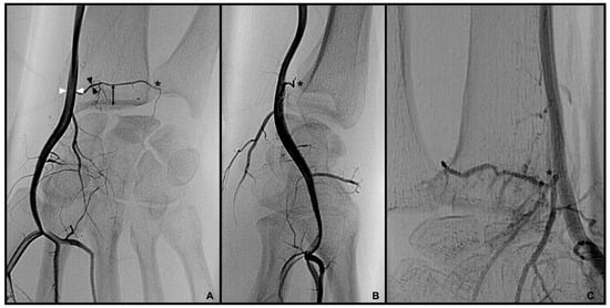 The maximum diameters of the PRCA and the DCBUA were measured in mm on superselective angiographies (Figure 2A and Figure 3). Both diameters were then related to the diameter of the main vessel, the radial, and ulnar artery, at the point of ramification, to account for smaller vessels in shorter or female patients (Figure 2A and Figure 3). It was determined if the PRCA was a main branch or part of a ramification (Figure 2A,C). On superselective angiographies, the contribution of the radial, ulnar, and AIA to the palmar radiocarpal arch was assessed, and the primary direction of the flow inside the arch was objectified. The diameter of the AIA was measured proximally to its main branches at the distal forearm in mm (Figure 4).