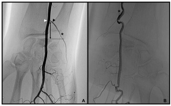 Palmo-dorsal projection angiographies were used to identify the PRCA and the DCBUA (Figure 2A and Figure 3). Lateral projections were used to ensure the palmar location of the vessel identified as PRCA (Figure 2B). For topographic classification, the distance from the PRCA to the midface of the radiocarpal joint and the distance from the DCBUA to the styloid process of the ulna were measured in mm (Figure 2A and Figure 3A).