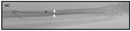 Palmo-dorsal superselective angiography of the * AIA. △ maximum diameter proximally to its main branches, MC inside the common interosseous artery (AIA = anterior interosseous artery; MC = microcatheter).