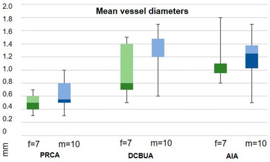 Mean vessel diameters of the palmar radiocarpal arch (PRCA), the dorsal carpal branch of the ulnar artery (DCBUA), and the interosseous artery (AIA) did not differ significantly between men (m) and women (f). Box plots with min/max values, median 25th and 75th percentile.