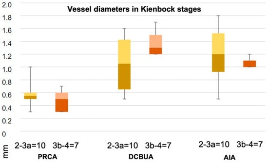 Mean vessel diameters of the palmar radiocarpal arch (PRCA), the dorsal carpal branch of the ulnar artery (DCBUA), and the anterior interosseous artery (AIA) in Kienbock’s disease stages 2–3a versus 3b did not differ significantly. Box plots with min/max values, median 25th and 75th percentile.