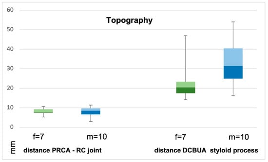 Distances from the palmar radiocarpal arch (PRCA) to the radiocarpal joint and from the dorsal carpal branch of the ulnar artery (DCBUA) to the styloid process of the ulna did not differ significantly between men (m) and women (f). Box plots with min/max values, median 25th and 75th percentile.