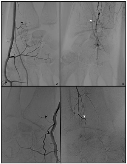 - Kim, S.; Eichenauer, F.; Asmus, A.; Mutze, S.; Eisenschenk, A.; Honigmann, P. Superselective angiography of the wrist in patients with Kienböck’s disease. BMC Musculoskelet. Disord. 2019, 20, 143. [Google Scholar] [CrossRef]