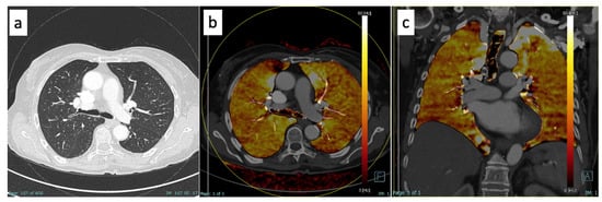 - Le Berre, A.; Boeken, T.; Caramella, C.; Afonso, D.; Nhy, C.; Saccenti, L.; Tardivel, A.-M.; Gerber, S.; Roche, A.F.; Emmerich, J.; et al. Dual-energy CT angiography reveals high prevalence of perfusion defects unrelated to pulmonary embolism in COVID-19 lesions. Insights Imaging 2021, 12, 24. [Google Scholar] [CrossRef]