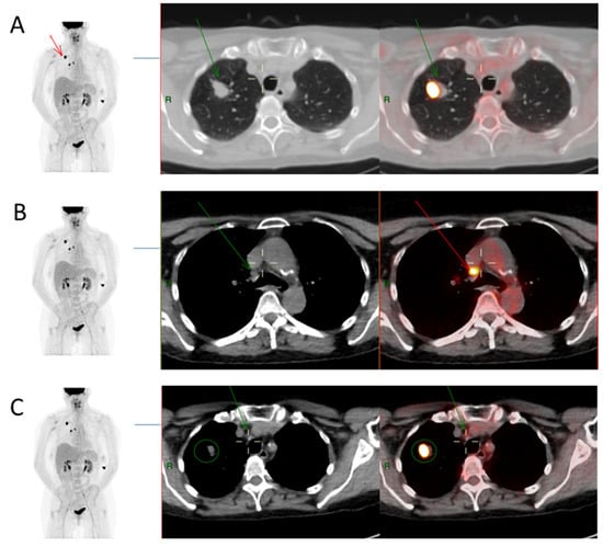 Extracted images from FDG PET/CT scan of a single patient (Case #52). (A) Primary tumour—FDG PET/CT images showing a right upper lobe tumour (red arrow in image on left and green arrow in Axial CT and fused PET/CT images) with measured SUVmax value of 26.1. SUVmax was also obtained from reference background structures: mediastinal blood pool (ascending aorta), SUVmax 2.9; and liver (right lobe), SUVmax 4.5. (B) Positive mediastinal lymph node on histology—SUVmax of mediastinal nodal station 4R (7 mm right lower paratracheal node, green arrow) was 8.0, hence SUV ratios of MR (8/2.9 = 2.8), LR (8/4.5 = 1.8), TR (8/26.1 = 0.3), and SR (8/7 = 1.1). 4R nodal pathology was confirmed to be metastatic. (C) the 4 mm mediastinal nodal station 2R (4 mm right upper paratracheal node, green arrow) has SUVmax value of 2.5, giving SUV ratios of MR (2.5/2.9 = 0.9), LR (2.5/4.5 = 0.6), TR (2.5/26.1 = 0.1), and SR (2.5/4 = 0.6). The 2R nodal pathology was benign. The primary tumour is illustrated by green circle in this image.