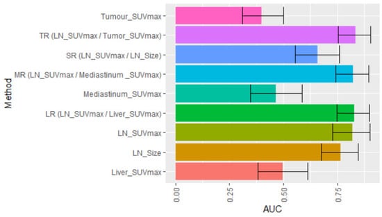 We further investigated whether normalised LN SUVmax values (SUV ratios) improved the prediction of N2 disease in comparison to unadjusted LN SUVmax or LN size. Our ROC curve comparison revealed highly comparable performance for the accuracy of N2 nodal staging based on AUC for LN SUVmax and the different derived ratios (Figure 2), with AUC values of TR, LR, MR, and SR ranging from 0.65 to 0.83. Based on the respective selected cut-off values, TR, LR, and MR improved the sensitivity of LN SUVmax alone from 68% to 81–89%. SR performs less well than the other three SUV ratios, with LR giving the highest sensitivity at 89.2% and an acceptable specificity at 68%. In this study, we analysed multiple normalisation ratios in the same patient cohort, thus extending published research on the limited number of normalised LN SUVmax ratios [28,29,30,31]. Consistent with our findings on LR, LN SUVmax to liver was shown to be associated with progression-free and overall survival in patients with NSCLC [32,33,34]. Future studies are required to test whether the adoption of LR in PET/CT imaging in clinical practice will translate into improved pre-operative accuracy in N2 nodal staging.