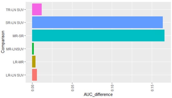 Pairwise analysis of AUC values of different ROC curves presented as bar graphs. TR = LN_SUVmax/Tumor_SUVmax; SR = LN_SUVmax/LN_Size; MR = LN_SUVmax/Mediastinum _SUVmax; LR = LN_SUVmax/Liver_SUVmax.