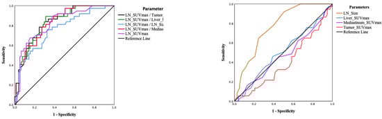ROC curve analysis comparing the diagnostic performance of individual markers for mediastinal (N2) nodal involvement and normalisation of SUVmax of the lymph nodes (LN_SUVmax) to factors of interest. The left-side panel shows ROC curves comparing various normalisation methods (ratios) to LN SUVmax, and the right-side panel shows the ROC curves for the other parameters examined.