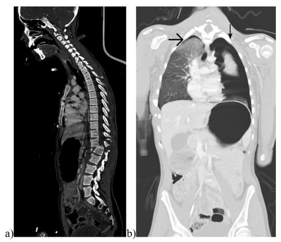 Images of a pediatric whole-body computed tomography (WBCT). Example of a 14-year-old girl with a traffic accident as a passenger in a car. CT images showing (a) a luxation fracture T12/L1 on sagittal plain in a bone window and (b) a pulmonary contusion and bilateral pneumothoraces on coronal plain in a lung window (marked by arrows).