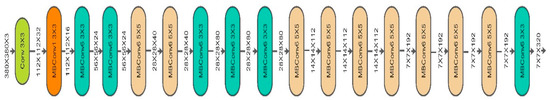 EfficientNet uses a compound coefficient to scale both the design and sizing of its convolutional neural network. This compound coefficient uniformly scales the depth, width, and resolution parameters to maintain consistency throughout the network. Unlike the traditional approach of unconstrained scaling of these parameters, the EfficientNet scaling approach employs a fixed set of scaling coefficients to uniformly adjust the resolution, width, and depth of the network. The concept underlying the compound scaling method is that, when the input images become larger, the network requires additional layers to expand its receptive field and more channels to detect finer details within the larger image. The fundamental EfficientNet-b0 network is composed of squeeze-and-excitation blocks, as well as MobileNetV2 inverted bottleneck residual blocks. The architecture of the EfficientNet-b0 model is shown in Figure 6.