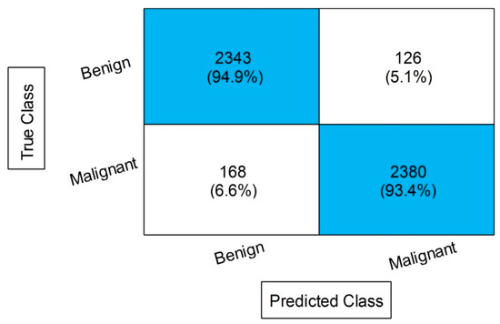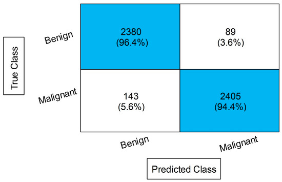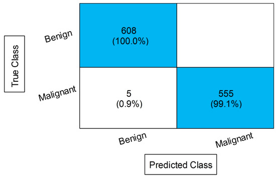 Table 8 displays the outcomes of the proposed feature fusion for the INbreast dataset. After the proposed fusion, we obtained an accuracy of 99.6% on MGSVM. The sensitivity rate of this classifier is 99.55, the precision rate is 99.6, the F1 score is 99.57, and the FNR is 0.45%. These values can be further calculated through a confusion matrix, given in Figure 12. In this figure, the diagonal values display the correct or accurate predicted values. The computational time is noted for each classifier, and it is observed that the time is increased after the proposed fusion process. However, the accuracy is significantly increased, which is the strength of this step. We proposed a feature selection approach to resolve the high computational time problem.