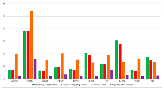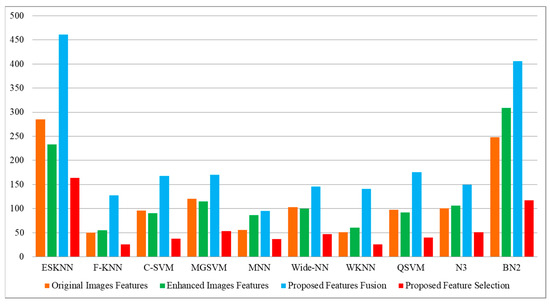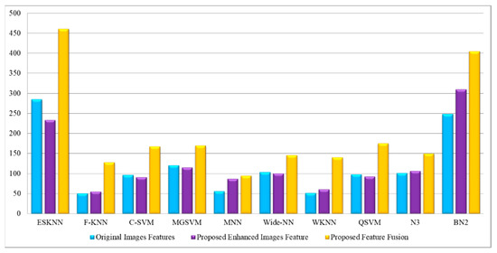 The outcomes of the proposed features are presented in Table 9 and achieved the maximum accuracy of 99.4% on cubic SVM. The sensitivity rate of this classifier is 99.4, the precision rate is 99.4, the F1 score is 99.4, and the FNR is 0.6%. A confusion matrix is illustrated in Figure 13, in which the diagonal values show the correct prediction. The computational time is noted for each classifier, listed in this table, and the noted minimum time is 2.1975 for the cubic SVM classifier. Compared to the original image features, contrast-enhanced image features, and fused features, the proposed selection method shows improved performance for both accuracy and time. The visual comparison, in terms of the computational time, is shown in Figure 14, which shows the clear strength of the proposed feature selection.