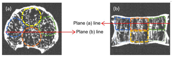 Volume of interest determination in cancellous bone. (a) Representative transverse image. (b) Coronal image. Both images are obtained by quarter-detector computed tomography. In the transverse direction, there were the following four regions: the ventral and dorsal directions, and the left and right directions. In the coronal image, eight cylindrical regions were set, which were divided into two from the center of the vertebral body in the cranial and caudal directions.