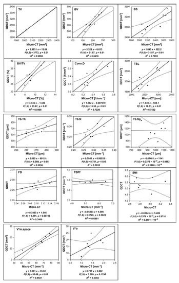 Figure 2 shows a scatter plot of cancellous bone morphometric parameters. A linear regression model was used with micro-CT as the explanatory variable and QDCT as the objective variable. No significance was observed for Tb.Sp, FD, TBPf, SMI, and V*tr for the regression equation using an F-test. A significant linear regression model could be applied for other bone morphometric parameters. All the bone morphometric parameters to which the linear regression equation could be applied resulted in positive coefficient estimates for explanatory variables.