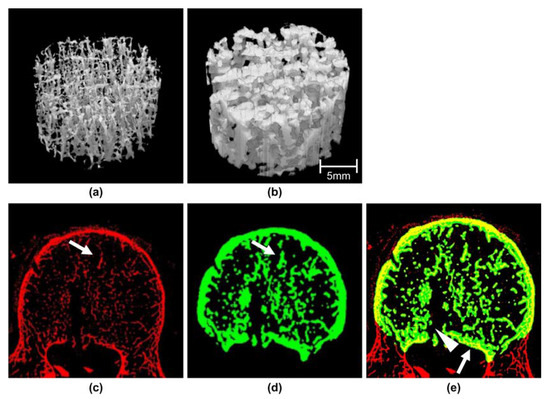 Figure 3 shows 3D and 2D images of the cancellous bone. There are visual differences between the modalities when compared in the 3D images. The cancellous bone extracted from micro-CT is thin (Figure 3c arrow), whereas the cancellous bone at the same site (Figure 3d arrow) extracted from QDCT is several times thicker. In the fusion image (Figure 3e), overlapping regions are displayed in fusion colors. In many cancellous bone regions, micro-CT images are superimposed on QDCT images. The site where the cancellous bone gathers (arrowhead in Figure 3e) is shown without being resolved in the QDCT image. In QDCT, as the bone width increases, agreement with micro-CT increases (Figure 3e arrow).