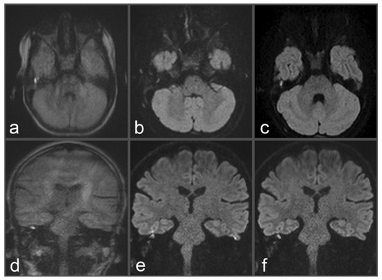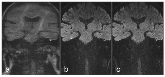 Several approaches have been proposed to reduce susceptibility-induced artifacts in EPI-DWI, in particular, the use of higher parallel imaging acceleration factors and dedicated post-processing techniques [22,23]. A recently developed post-processing technique that can reduce susceptibility-induced distortions builds on acquiring pairs of echo-planar images with opposing phase-encoding polarities but otherwise identical settings. From these image pairs, the susceptibility-induced off-resonance field can be estimated as described by Andersson et al. and implemented in Functional MRI of the Brain Software Library (FSL; the “topup” method); and the two images can then be combined into a single corrected one [24,25]. Based on this principle, topup-corrected rsDWI sequences (topupDWI) may show reduced distortion, which may be especially beneficial in the temporal region due to its inhomogeneous magnetic environment.