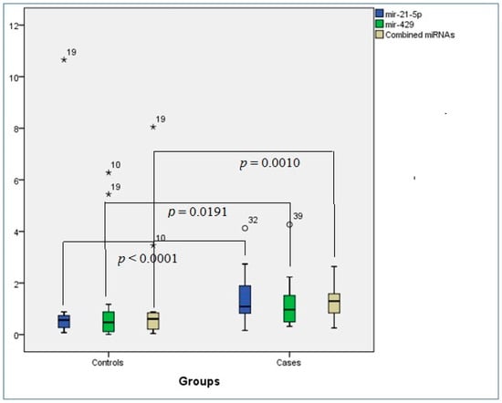 As can be seen in Table 2, the median ΔCT in the miR-21-5p expression was 0.57 in the control group and 1.09 in the case group; a significant difference (p < 0.0001) in the expression of miR-21-5p was observed between case and control groups. The median ΔCT for miR-429 expression in the control group (0.47) was significantly lower (p = 0.0191) than in the case group (0.97). In addition, the median ΔCT in the combined miRs expression was 1.29 in the case group and 0.61 in the control group; a significant difference (p = 0.0010) in the expression of miR-21-5p was observed between case and control groups. The boxplot chart for the median expression of miRNAs among the OSCC and control groups is shown in Figure 1.