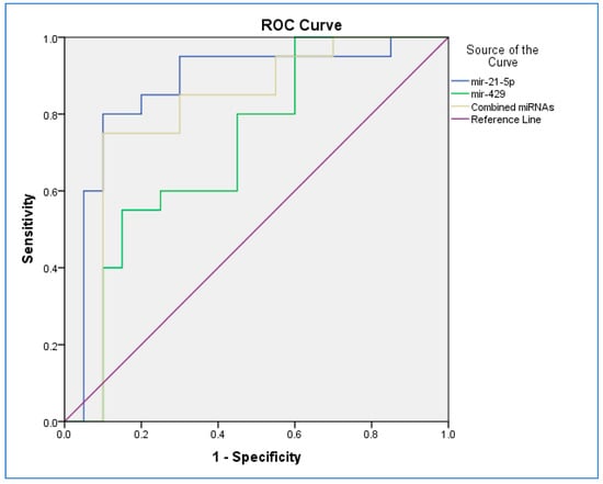 The receiver operating characteristic (ROC) curve for miR-21-5p and miR-429 and combined miRNAs.