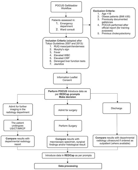 - Pereira, J.; Bass, G.A.; Mariani, D.; Dumbrava, B.D.; Casamassima, A.; Da Silva, A.R.; Pinheiro, L.; Martinez-Casas, I.; Zago, M. Surgeon-performed point-of-care ultrasound for acute cholecystitis: Indications and limitations: A European Society for Trauma and Emergency Surgery (ESTES) consensus statement. Eur. J. Trauma Emerg. Surg. 2020, 46, 173–183. [Google Scholar] [CrossRef]